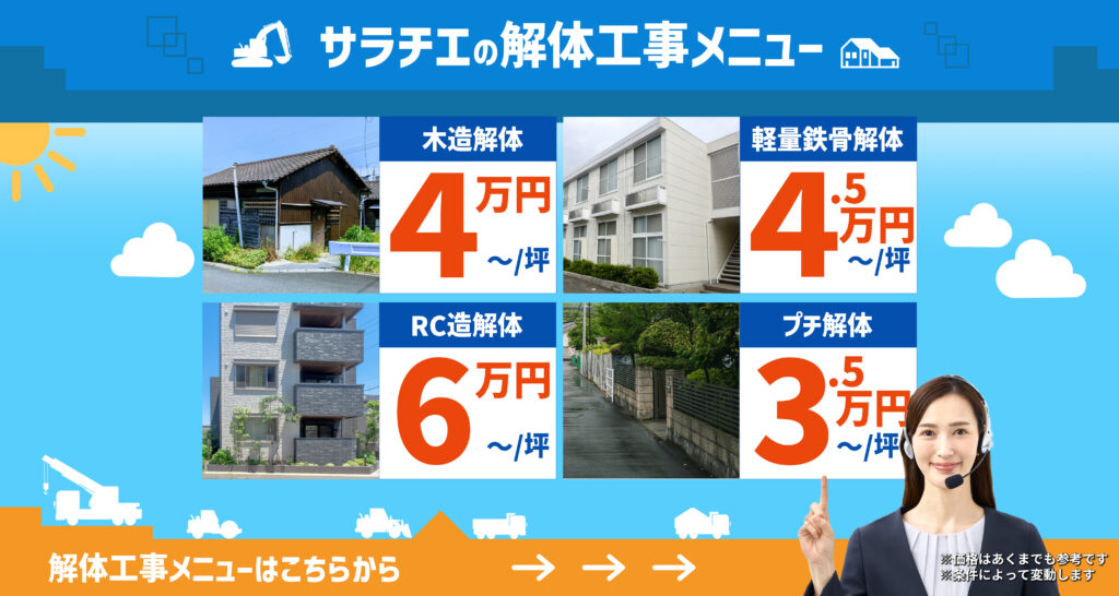 家屋・一戸建てやマンションなどの中規模・大規模の建物解体から、店舗の内装解体、アスベスト調査・除去、舗装工事、小規模解体まで幅広く対応しています。