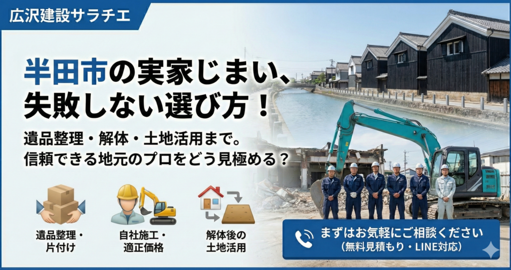 私たちは半田市の解体業者として、片付けから解体、補助金申請、そして解体後の土地活用のご提案まで、ワンストップでサポートします。