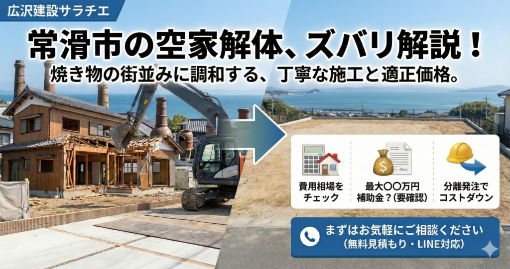 この記事では、常滑市の地形を知り尽くした解体業者が、常滑市の空き家解体にかかる費用相場、狭い場所での**「手壊し解体」の仕組み、そして活用すべき最大30万円の補助金**について解説します。