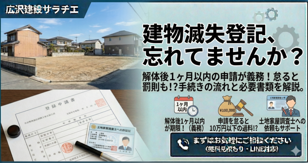 これをやらないと、家はなくなったのに、法務局の記録上は「まだ建物が存在している」ことになってしまいます。 その結果、固定資産税の請求が止まらなかったり、最悪の場合は**10万円以下の過料(罰金)**を科されたりするリスクがあります。