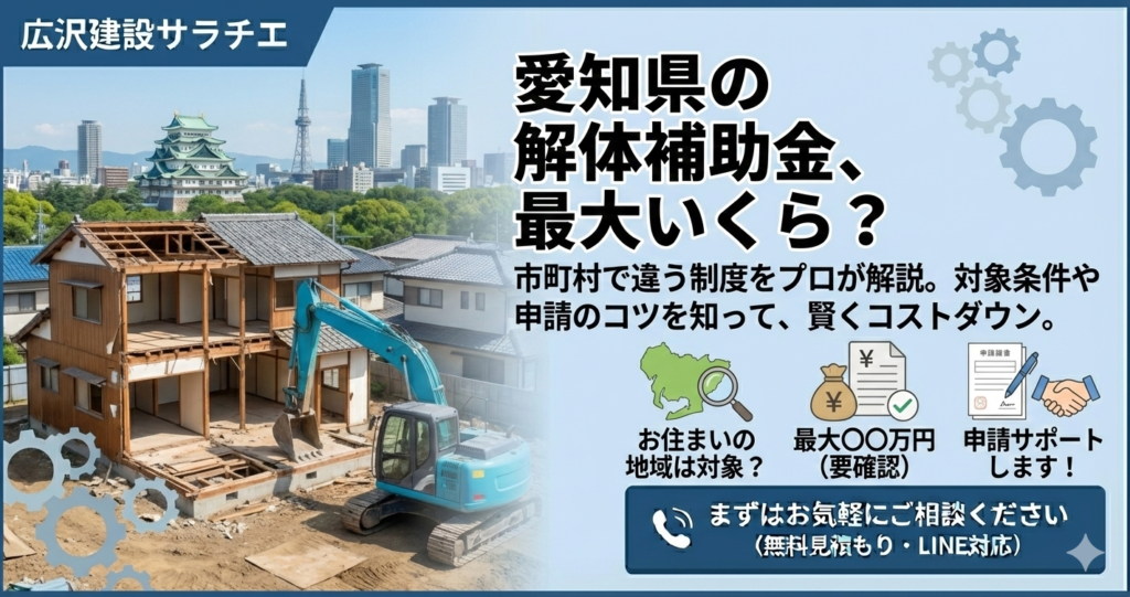 実は、愛知県は南海トラフ地震への対策意識が高く、全国的に見ても「解体工事への補助金制度」が充実しているエリアです。