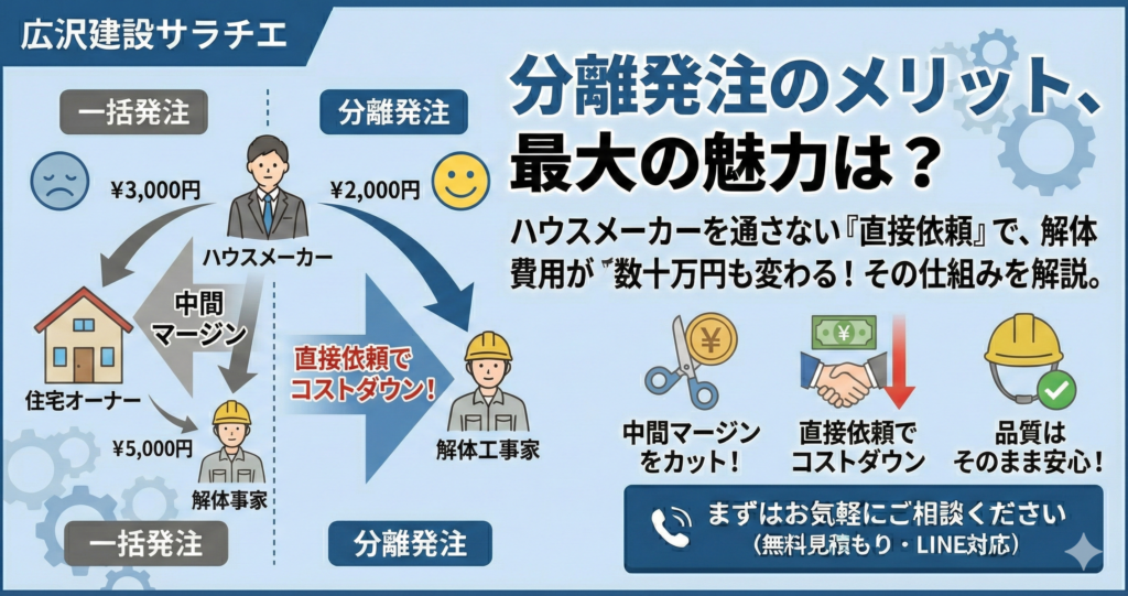 そこで今、賢い施主様の間で常識になりつつあるのが、解体工事をハウスメーカーから切り離して専門業者に直接依頼する**「分離発注」**という方法です。