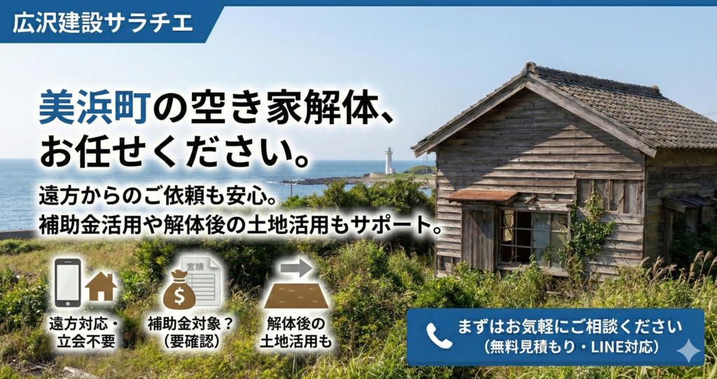この記事では、美浜町での解体実績豊富な私たちが、空き家の解体費用相場、知っておくべき**「特定空家」のリスク**、そして補助金を使って賢く処分する方法について解説します。