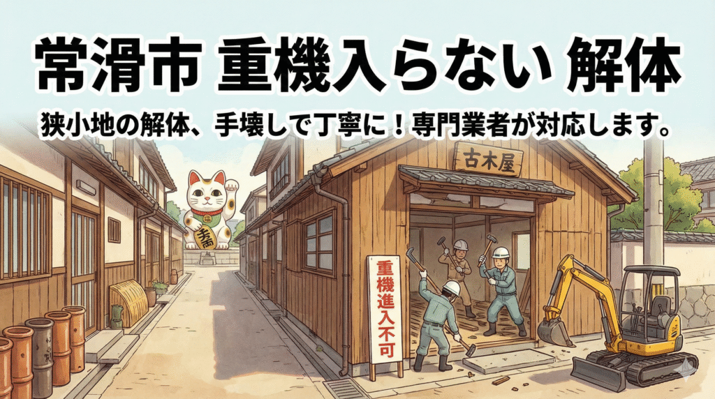 「重機が入らない現場の解体経験がありますか?」と直接確認しましょう。常滑市やその周辺(半田市、知多市、東海市など)で狭小地の解体実績がある業者であれば、地域の特性を理解した対応が期待できます。