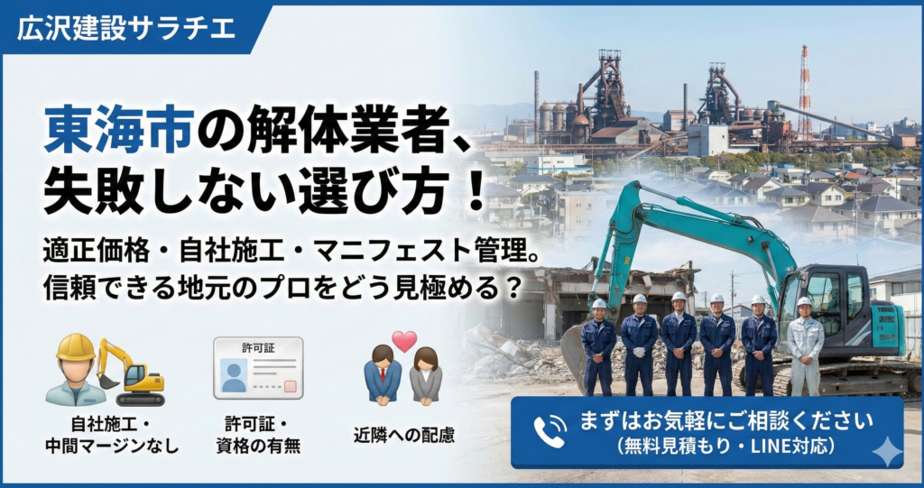 この記事では、東海市で長年解体工事を行ってきた私たちが、プロの視点で教える**「失敗しない解体業者の選び方」と、適正な費用相場**について解説します。